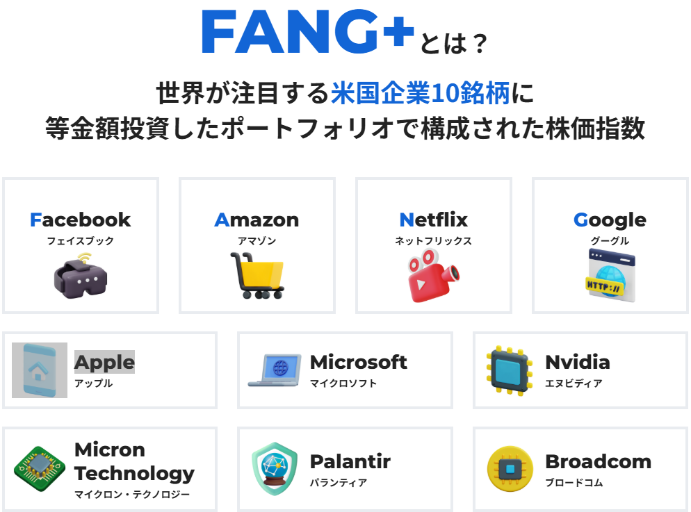 名前からは旧来のFANG銘柄だけを集めた指数のように見えますが、実際にはメタ・アマゾン・ネットフリックス・アルファベットに加え、アップル・マイクロソフト・エヌビディアなどの時代を代表する成長企業群が組み入れ対象となります。