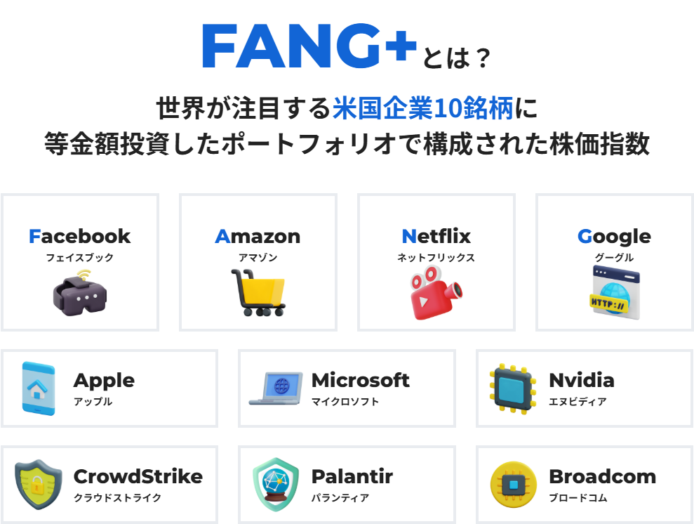 FANG+は、米国の代表的な成長企業(主に大型テック)を中心に10銘柄で構成される株価指数です。