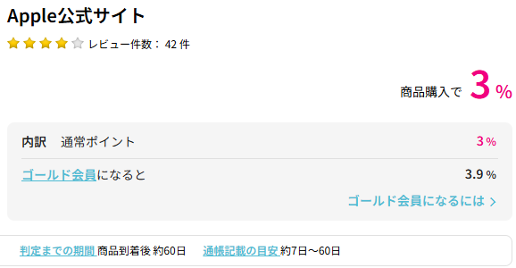 ハピタスに掲載されているApple公式サイト広告のポイント獲得条件は以下の通りです。