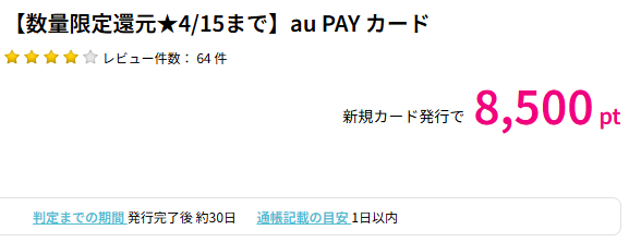 ハピタスに掲載されているau PAY カード広告のポイント獲得条件は以下の通りです。