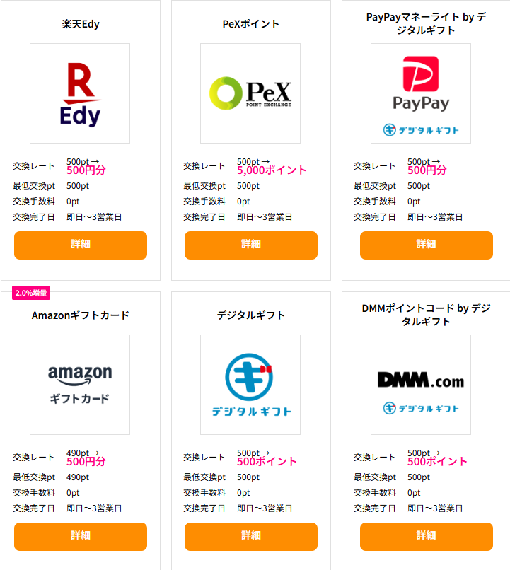 1ポイントから交換できる交換先も用意されているため、ハピタスで貯めたポイントが持ち腐れる心配はありません。