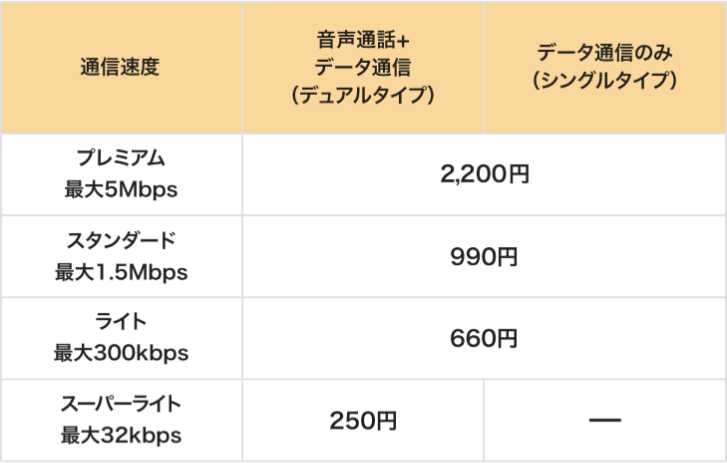 音声通話SIMタイプもデータ通信専用SIMも同じ料金です。