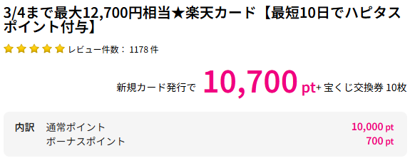ハピタスを経由してから楽天カードを申し込むことで、ハピタスのポイント(10700ポイント)と楽天カード入会特典の楽天ポイント(2000ポイント)を二重取りできます。