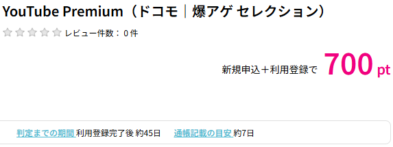 ハピタスに掲載されているドコモ×YouTube Premium広告のポイント獲得条件は以下の通りです。