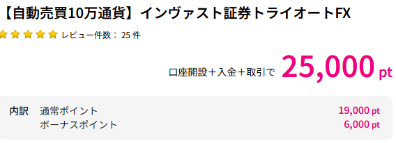 このページを更新した時点では、インヴァスト証券のトライオートFX口座開設は複数のポイントサイトで高還元に設定されています。