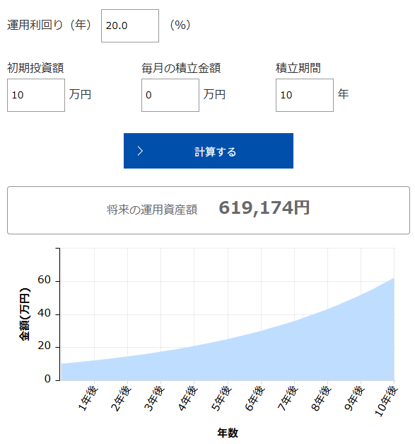 レバナスに10万円を一括投資し、10年間完全に放置した場合のシミュレーションを行います。