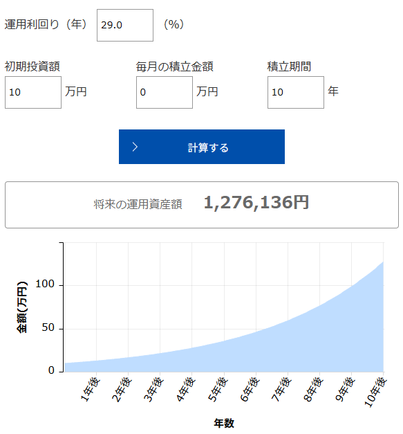 レバナスで10万円を100万円に増やすには、年率29%以上のリターンを約10年間継続する必要があります。