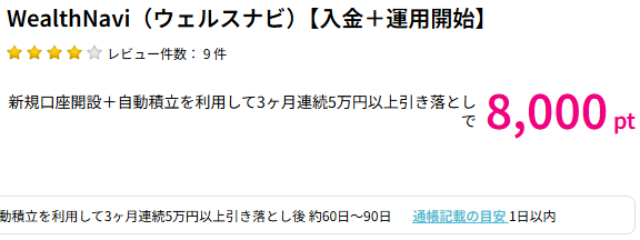 ハピタスに掲載されているWealthNavi(ウェルスナビ)広告のポイント獲得条件は以下の通りです。