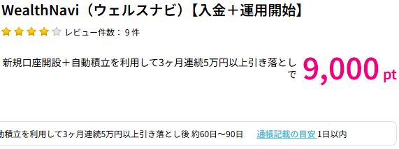 ハピタスに掲載されているWealthNavi(ウェルスナビ)広告のポイント獲得条件は以下の通りです。